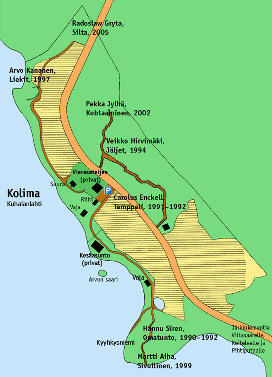 Kartasta näet veistosten sijainnin Tuulensuun ympäristössä. Veistoksien luokse pääset karttaan ruskealla merkittyjä polkuja pitkin. Ota huomioon, että ateljeetalo ja kesäasunto ovat yksityisiä